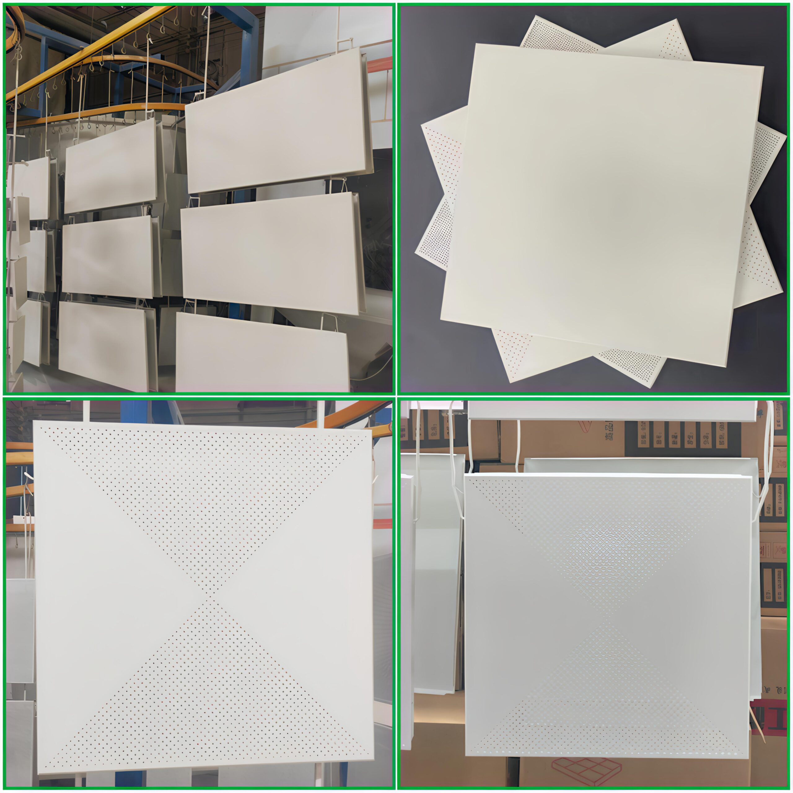 Aluminum ceiling panel is become more popular recent years. Rectangular sized panel are more often used in business buildings, public buildings, such as meeting halls, railway stations, hospitals, airport stations, normally the sizes of ceiling panel are larger than that of residential buildings. The size maybe 600*600, 600*1200, 1200*1200, and etc. In addtion, there is always the requirement of mesh holes on the panel for public building so as to get better ventilation performance. While the size of panel for domestic use is relatively smaller, the dimension is 300*300, there is rarely a requirement to have mesh holes on ceiling panel surface for domestic application.